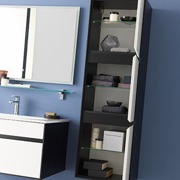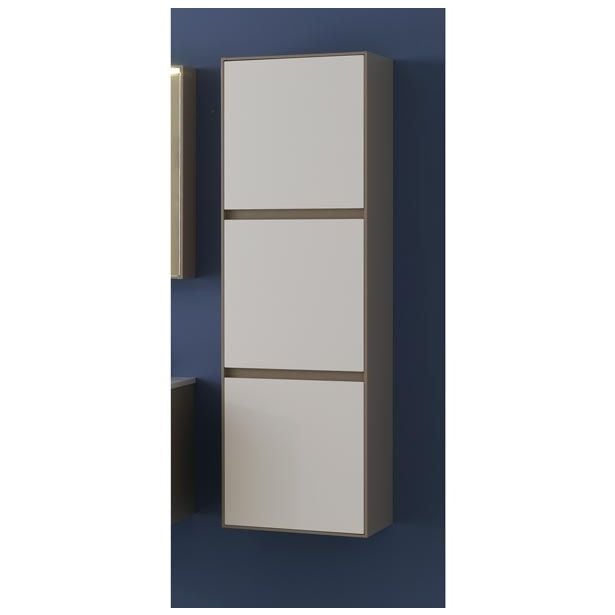 Razdeljena na več prostora s tremi steklenimi policami. Omara omogoča organizirano shranjevanje raznovrstnih kopalniških dodatkov. Njena velikodušna notranjost je dovolj prostorna, da sprejme večino potrebščin, ohranja pa čist in urejen videz kopalnice. Z odpiranjem vrat na potisk omara izžareva nezgrešljiv slog, zaznamovan z ravnimi linijami in čistimi oblikami. Točno določene barvne kombinacije, kot je bež- bela, poudarjajo klasičnost in brezčasnost dizajna.