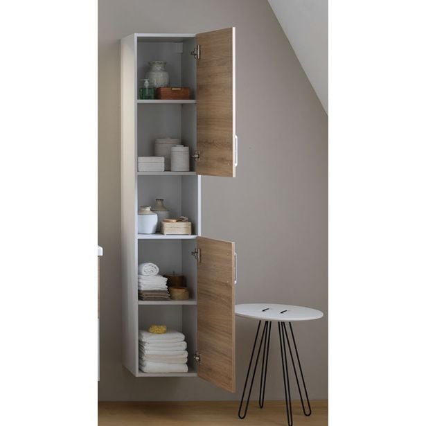 Eleganten dizajn in praktična funkcionalnost združena v visoki kopalniški omari E 1702 GREY/OAK iz serije Evelin. Ta viseča omara, izdelana iz kakovostnega LTD materiala, ponuja estetsko dovršenost in uporabnost. Aluminijasti zaobljeni ročaji dodajo piko na i elegantnemu videzu in omogočajo enostavno odpiranje vrat. Kombinacija odprte police na sredini omare in zaprti omarici (zgoraj in spodaj),zagotavlja raznovrstnost shranjevanja, ki zadovolji vaše potrebe po urejenosti in stilu.