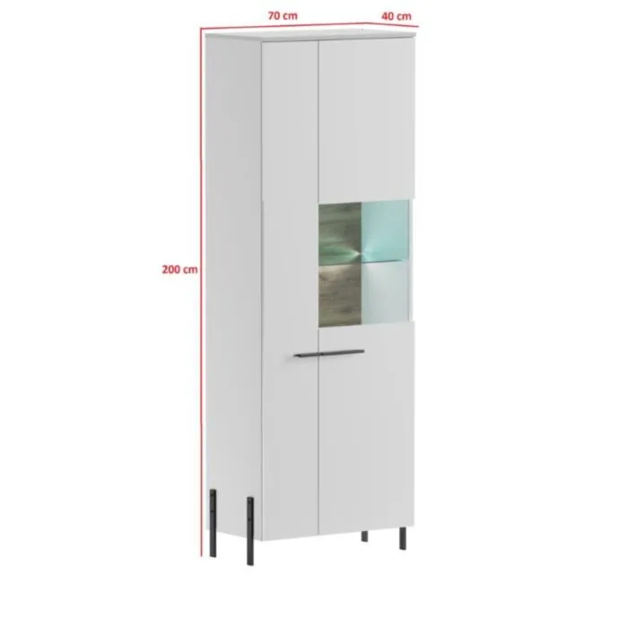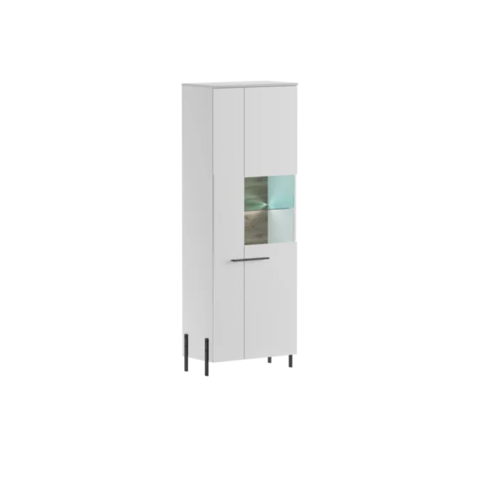 Vitrina JUSTINA je narejena iz kvalitetne laminirane plošče, 16 mm debeline in ABS robovi. Stranice so v beli mat barvi, fronte pa v beli visoki sijaj. Vitrina ima kaljeno steklo debeline 4mm, katera vsebuje stekleno polico debeline 5mm. V vitrini je LED osvetljava. Nogice so metalne črne barve.