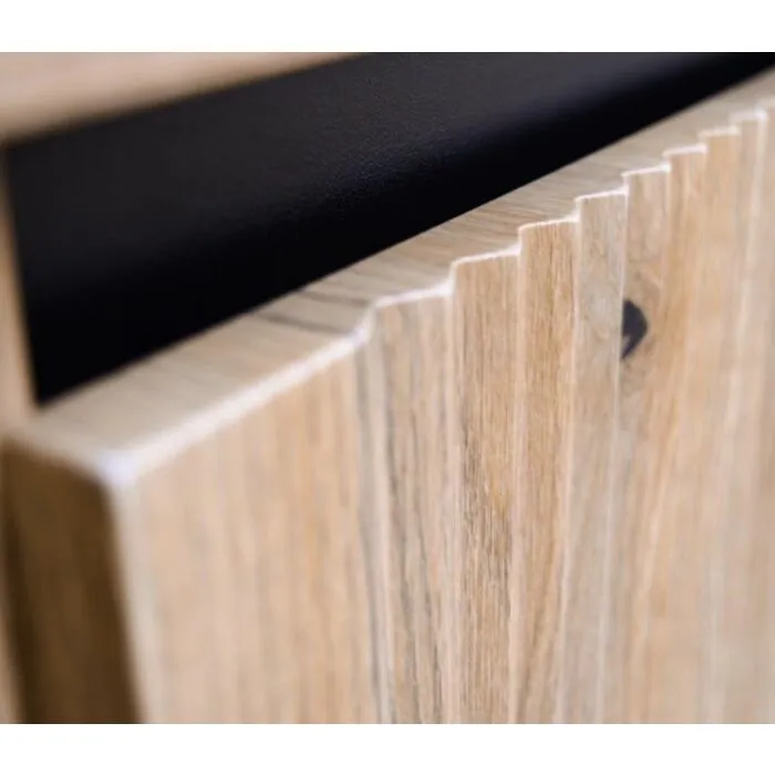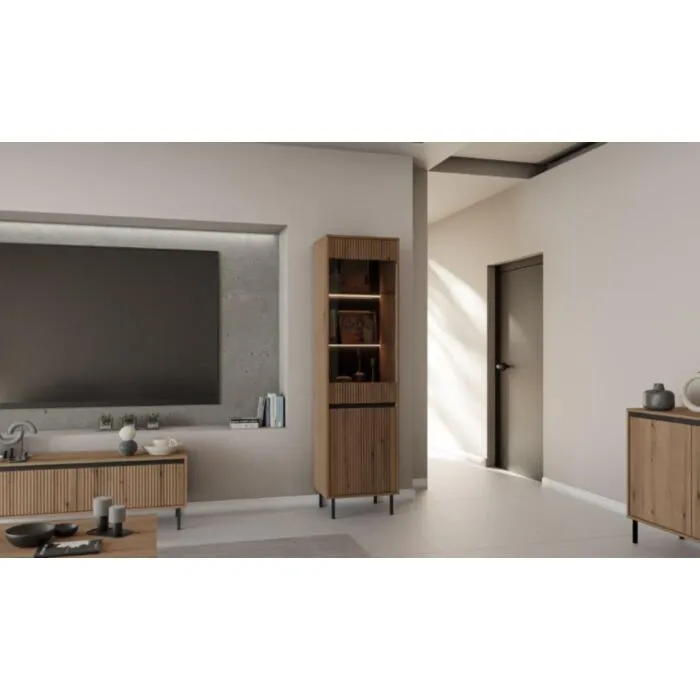 Robovi so obdelani z ABS materialom, kar povečuje odpornost na obrabo in podaljšuje življenjsko dobo pohištva. Fronte so iz MDF plošč debeline 16 mm in prav tako v hrast barvi, kar dodaja eleganco in sodoben pridih. Vitrina se ponaša z elegantnimi nogicami v črni metal barvi, katerih višina znaša 15 cm.