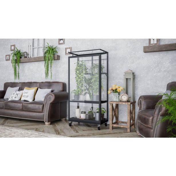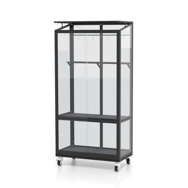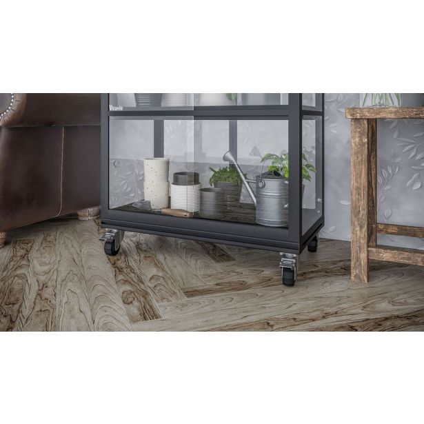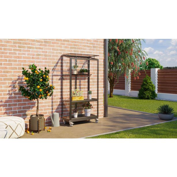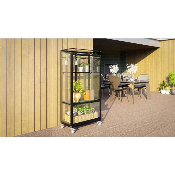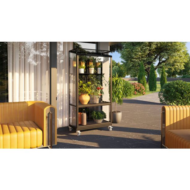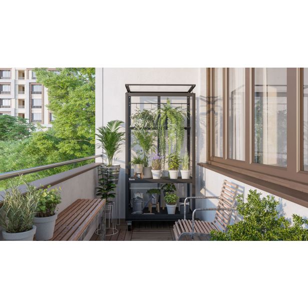 Balkonski rastlinjak Vitavia Polis 350 ESG z aluminijasto konstrukcijo in ESG steklom debeline 3 mm nudi zaščito rastlinam na manjših površinah. Enostaven za montažo in vzdržljiv, vključno s tlemi, kolesi in polico v črni barvi.