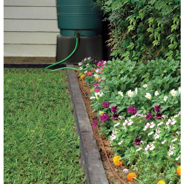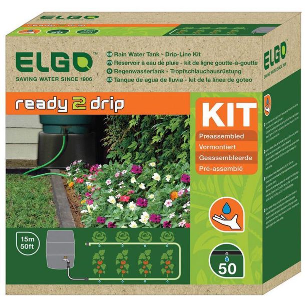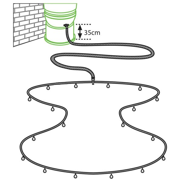Število kapljalnikov: 50 kosov | Količina pretoka: 0,3-0,5 l/h (odvisno od nivoja v rezervoarju za deževnico) | Krmiljenje: možno z uro za namakanje EMT | Nasvet: namestite 35 cm nad gredo (za enakomeren tok) | Vključno s 5 m vrtne cevi, priključkom za rezervoar za deževnico in vrtno cev, razdelilnikom za cev za