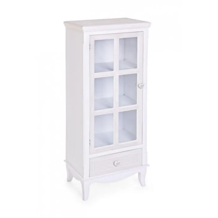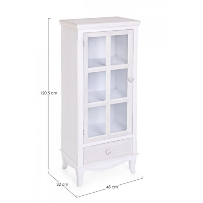 Vitrina 1A-1C CHARLENE je narejena iz MDF-ja in ima gumbe iz polismole. Gumbi vitirine so v oblliki srca, kar še posebaj popestri celoten izgled. Vitrina je elegantna in s svojo barvno kombinacijo se ujame v vsakem prostoru.
