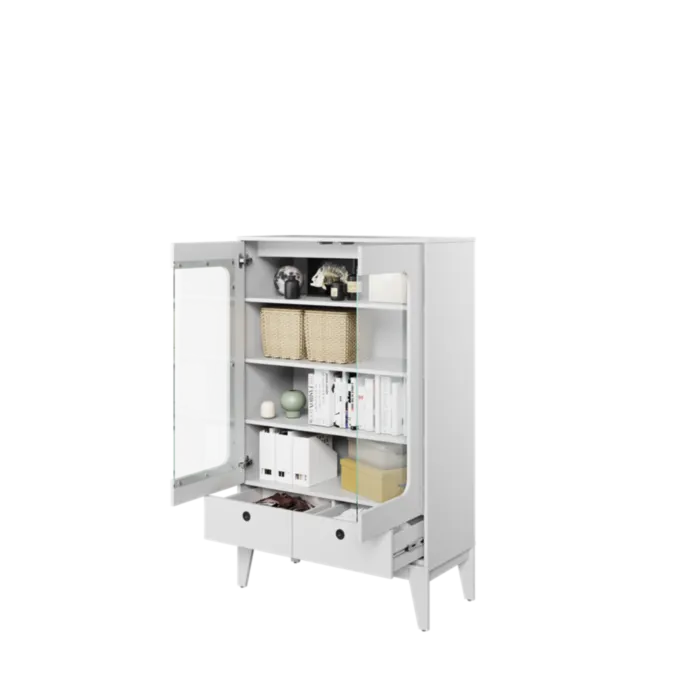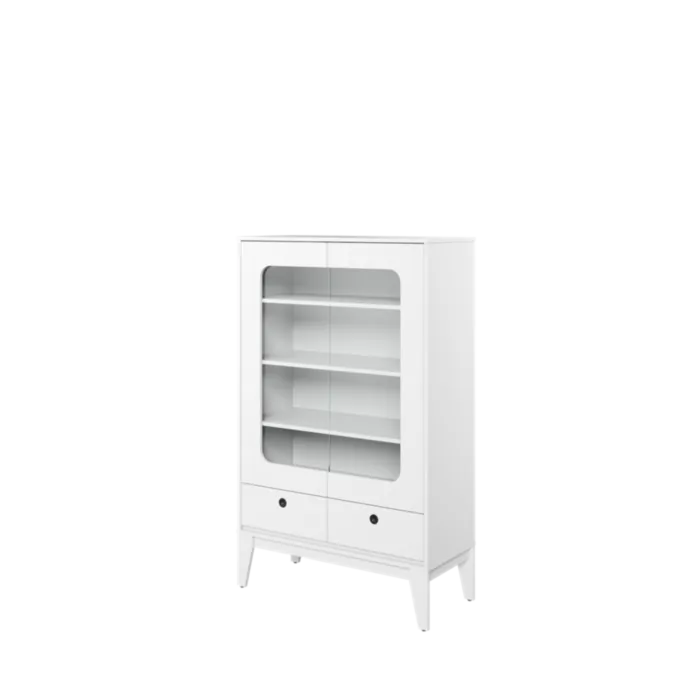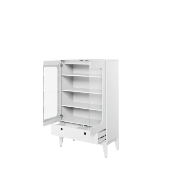 Vitrina FAMA je narejena iz kvalitetne laminirane plošče s ABS robovi. Dobavljiva je v beli mat barvi s črnimi ročkami. Odlično se lahko kombinira s ostalimi izdelki iz kolekcije FAMA.