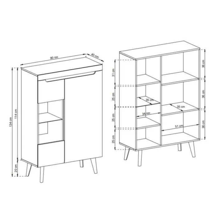 Elegantna vitrina RON v skandinavskem slogu je popolna izbira za ljubitelje prefinjene preprostosti in naravnih materialov. Na voljo je v hrastovem odtenku, kar ji daje toplino in modernost hkrati. Ima hrastove lesene noge, ABS robove za večjo vzdržljivost, vrata oziroma ličnice pa so narejene iz kakovostnega MDF-ja.