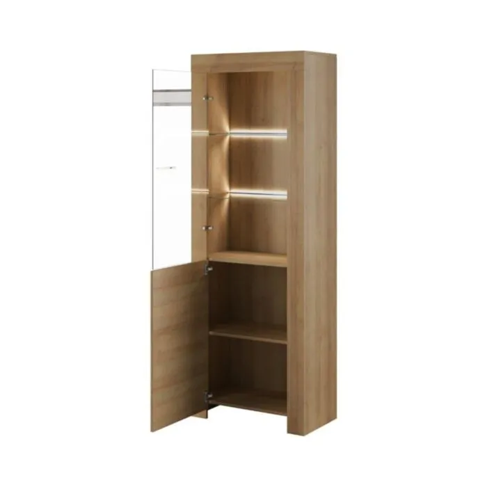Visoka vitrina KYS 120, vam omogočajo, da na funkcionalen in estetski način opremite svojo dnevno sobo. Zasnovana je za enostavno kombiniranje z drugimi kosi pohištva , kar omogoča ustvarjanje usklajenega inurejenega prostora. Komoda je narejena v elegantnem hrastovem odtenku, ki prinaša toplino in naravni videz v vaš dom. Ima ABS robove, ki zagotavljajo dolgotrajno odpornost na poškodbe.