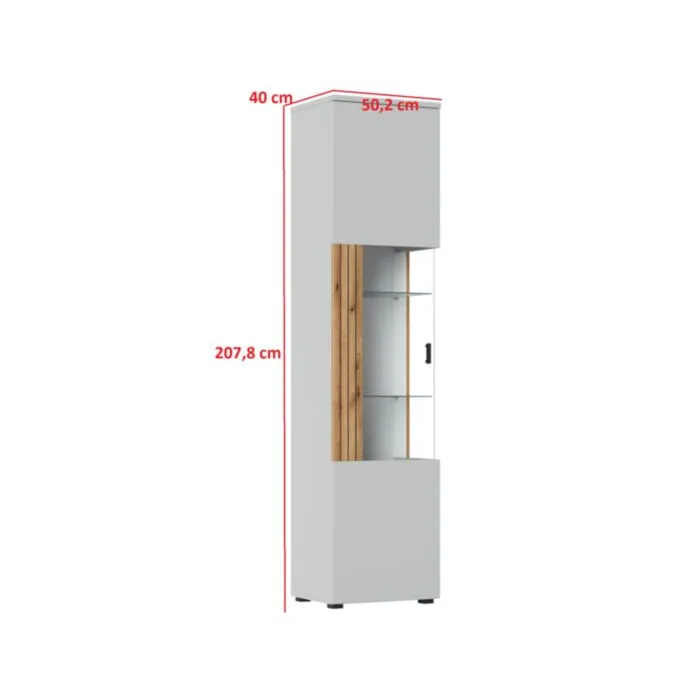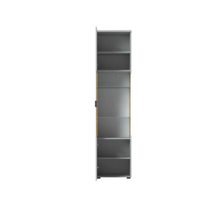 Elegantna vitrina VIVIJA v hrastovi in sivi barvi prinaša brezčasno eleganco v vsak prostor. Izdelana je iz visokokakovostne iverne plošče debeline 16-22 mm in MDF-ja, zaščitena z ABS robovi, ki zagotavljajo dolgotrajno vzdržljivost in odpornost za vsakodnevno uporabo.