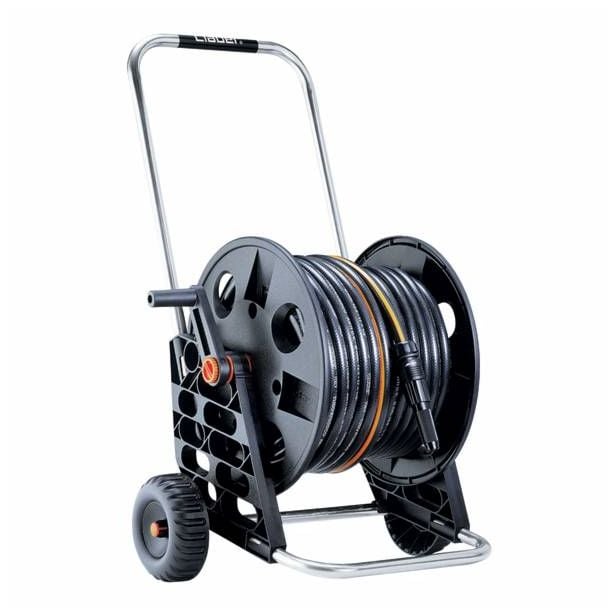 Voziček s cevjo dolžine 30 m, 1/2″, z nerjavnim aluminijastim obročem, na kolesih, komplet spojk z brizgalko.