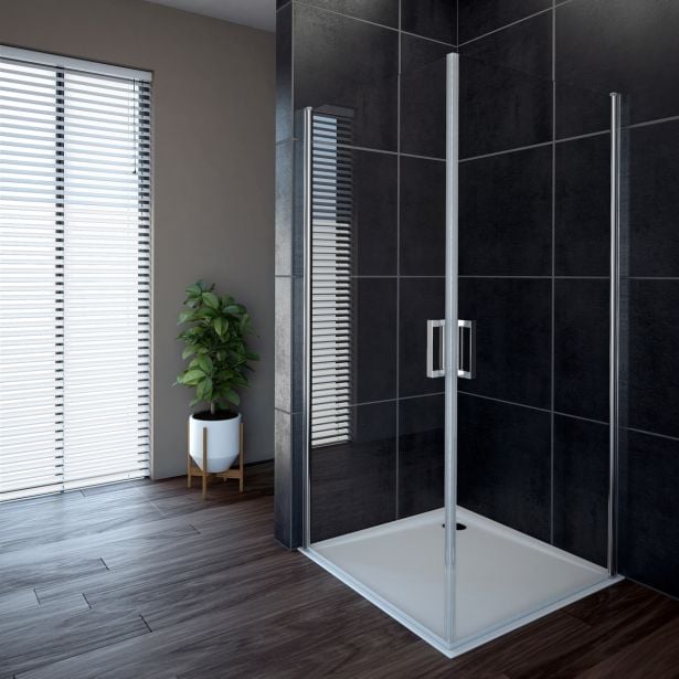 Kaljeno prozorno steklo debeline 6 mm z nano premazom proti vodnemu kamnu. Srebrni profili. Vrata so opremljena z dvižnim sistemom in se odpirajo v obe smeri.