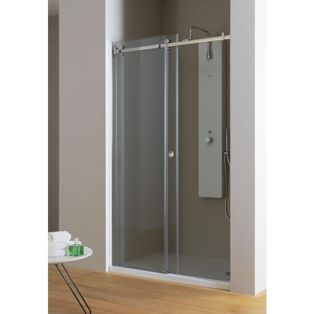 Univerzalna samostojna tuš vrata, enostransko odpiranje, iz kaljenega prozornega stekla, debeline 8 mm, s Silver Brill profilom.