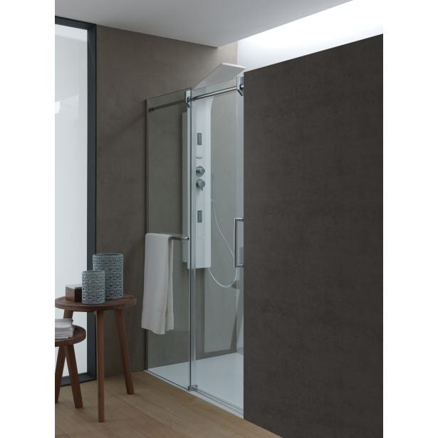 Tuš vrata (univerzalna) s kaljenim 8 mm prozornim steklom, Silver Brill profili in držalom za brisače.