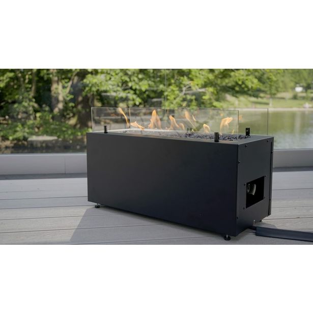 Dimnik ni potreben zaradi zunanje uporabe in plina. Možna regulacija velikosti plamena. Kamin je izdelan iz jekla, stekleni del pa iz kaljenega stekla. Priloženo pokrivalo za kamin.
