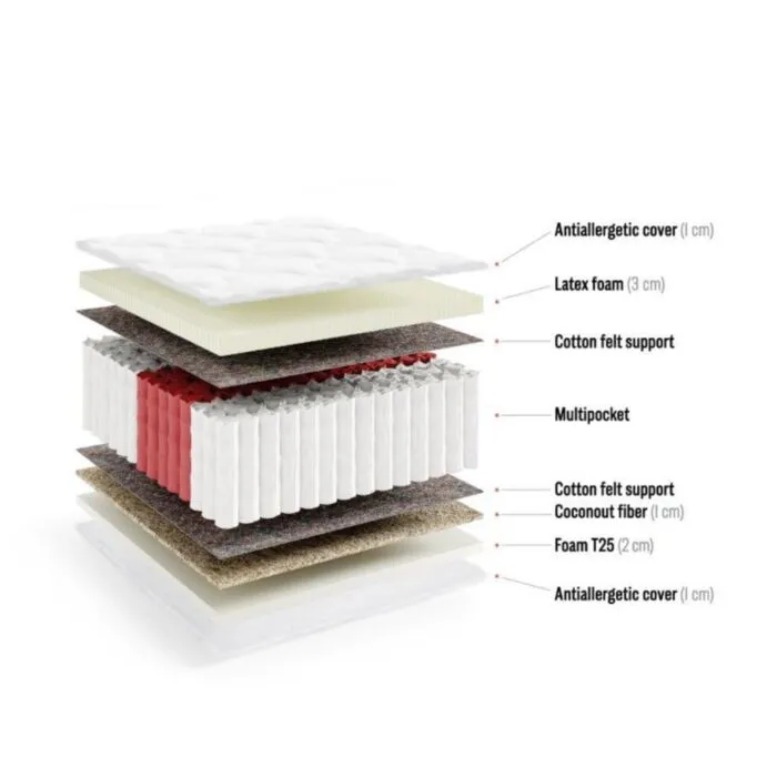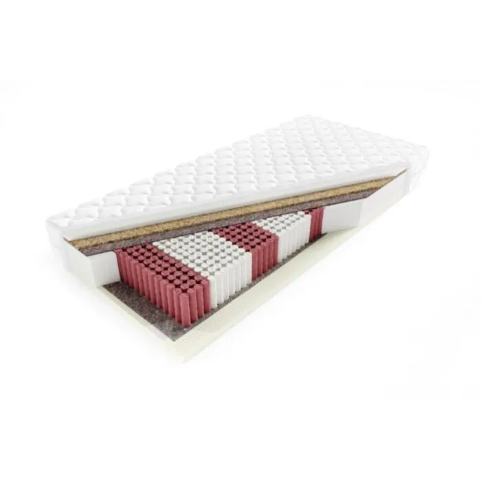 Vzmetnica RELAX je dvostransko ležišče iz pene. Izdelana je iz žepkastih vzmeti Multipocket – 7 trdotnih območij, obloženih z 1 cm debelo kokosovo ploščo na eni strani in 2 cm debelo peno na drugi strani. Ima pralno prevleko.