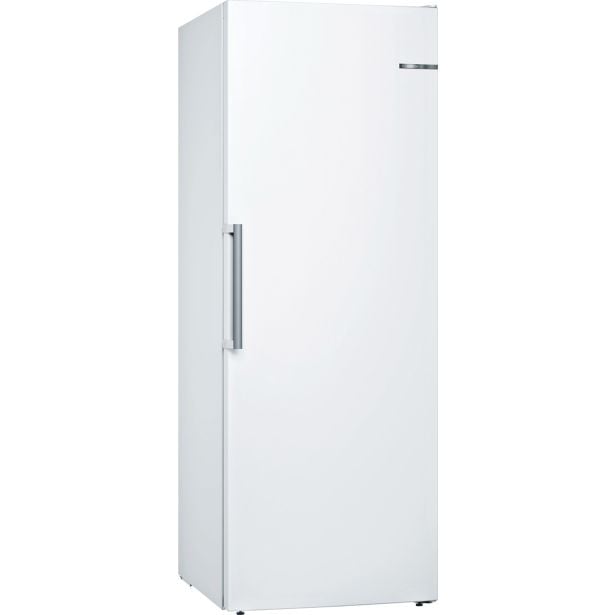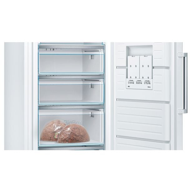 Samostoječa zamrzovalna omara Bosch z uporabno prostornino 365 l ima elektronsko uravnavanje temperature z digitalnim prikazom. 5 zamrzovalnih predalov in 3 zamrzovalni prostori z vratci.