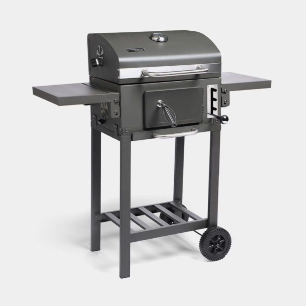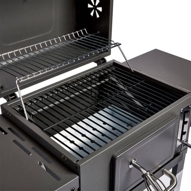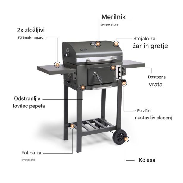 Dve zložljivi stranski polici nudita prostor za kuhinjske pripomočke in pijačo, spodnja odlagalna polica pa omogoča shranjevanje dodatnega oglja ali lesa, da je vedno pri roki.