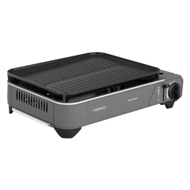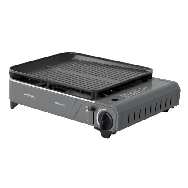Kamping žar Bistro grill, rebrena grill plošča z iztekom za maščobo, posoda za maščobo, elektronski vžig, deluje na kartušo