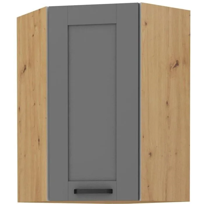 Zgornja kotna omara LIMA 60×60G 90V je sestavljena iz MDF plošče, debeline 16 mm, robovi so iz ABS 1 mm, ročaji pa so iz kovine v črni barvi. Korpus je narejen iz laminirane plošče, debeline 16 mm, robovi so iz melamina. Kuhinjski element je na voljo v barvi sivi/hrast in ima mehko zapiranje.