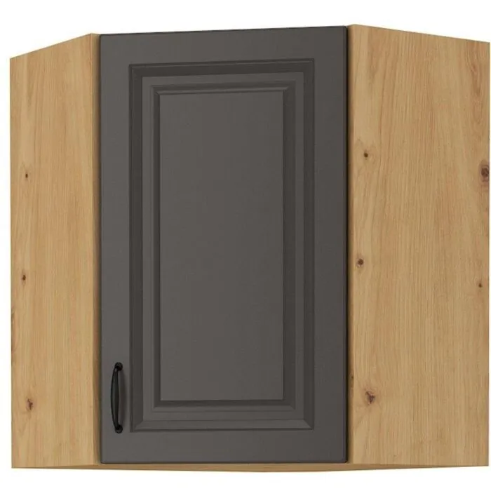 Zgornja kotna omara PRESTIGE 60 x 60G 71V je sestavljena iz MDF plošče, debeline 16 mm, robovi so iz ABS 1 mm, ročaji pa so iz kovine v črni barvi. Korpus je narejen iz laminirane plošče, debeline 16 mm, robovi so iz melamina. Kuhinjski element je na voljo v barvi grafit / hrast in ima mehko zapiranje.