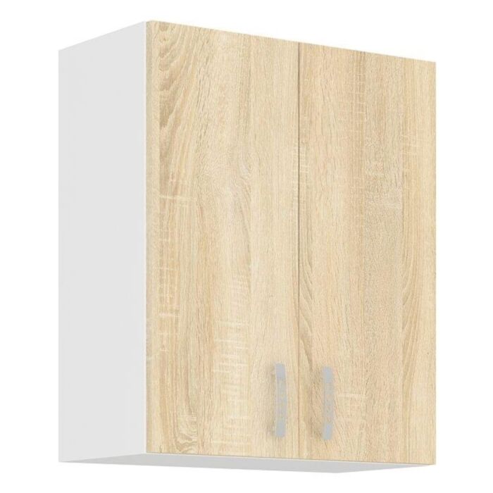 Zgornja omara ARA 60G je sestavljena iz fronte in korpusa iz MDF plošče, debeline 16 mm. Robovi so iz melamina. Ročaji so sivi. Na voljo je v barvi sonome in hrasta. V komentarju dopišete, katero barvno kombinacijo želite.