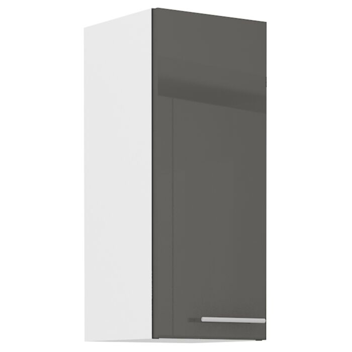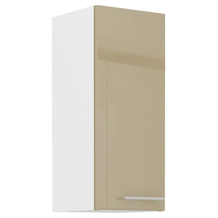 Zgornja omara ELZA 30G je sestavljena iz fronte iz MDF plošče, debeline 16 mm, robovi so iz ABS 1 mm. Korpus je narejen iz laminirane plošče, debeline 16 mm, robovi so iz melamina. Kuhinjski element je na voljo v capuccino barvi visoki sijaj, beli barvi visoki sijaj in sivi barvi visoki sijaj. V komentarju dopišete, katero barvno kombinacijo želite. Kuhinjski element ima sistem mehkega zapiranja.
