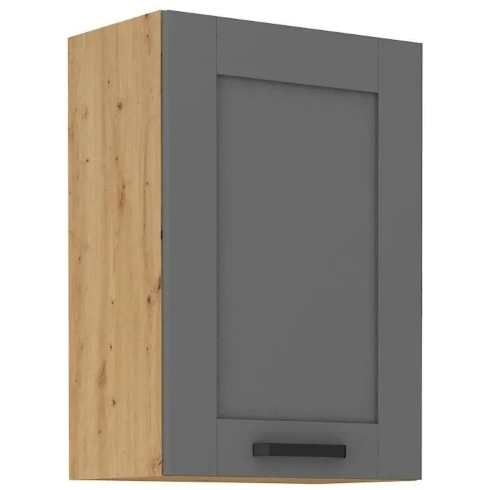 Zgornja omara LIMA 50G 71V je sestavljena iz MDF plošče, debeline 16 mm, robovi so iz ABS 1 mm, ročaji pa so iz kovine v črni barvi. Korpus je narejen iz laminirane plošče, debeline 16 mm, robovi so iz melamina. Kuhinjski element je na voljo v barvi siva/hrast in ima mehko zapiranje.