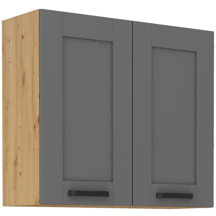 Zgornja omara LIMA 80G 71V je sestavljena iz MDF plošče, debeline 16 mm, robovi so iz ABS 1 mm, ročaji pa so iz kovine v črni barvi. Korpus je narejen iz laminirane plošče, debeline 16 mm, robovi so iz melamina. Kuhinjski element je na voljo v barvi siva/hrast in ima mehko zapiranje.