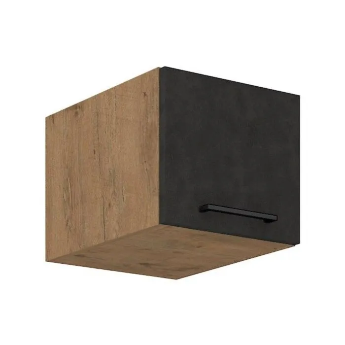 Zgornja omara PARIZ 40G dvižna je sestavljena iz fronte iz MDF plošče, debeline 16 mm, robovi so iz ABS 1 mm, ročaj je iz plastike v sivi barvi, debeline 19,2 mm. Korpus je narejen iz laminirane plošče, debeline 16 mm, robovi so iz melamina. Kuhinjski element je na voljo v barvi hrasta z matero in ima mehko zapiranje.