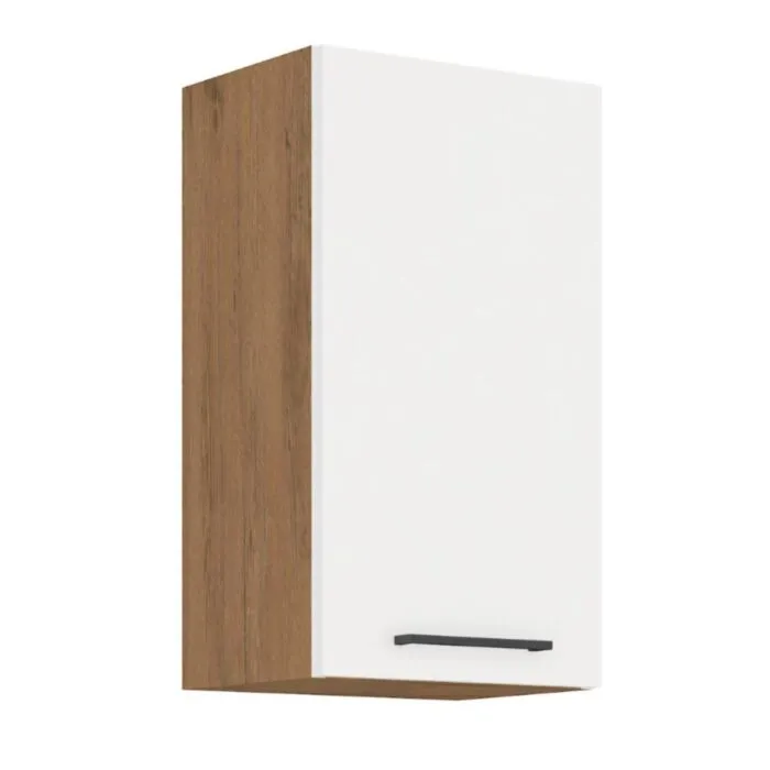 Zgornja omara PARIZ GLOS 45G je sestavljena iz fronte iz laminirane plošče, debeline 16 mm, robovi so iz ABS 1 mm, ročaji so iz plastike. Korpus je iz laminirane plošče in ima melaminske obrobe. Kuhinjski element je na voljo v barvi belega visokega sijaja s hrastom in ima mehko zapiranje.