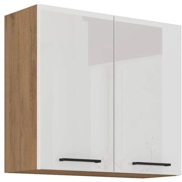 Zgornja omara PARIZ GLOS 80G je sestavljena iz fronte iz laminirane plošče, debeline 16 mm, robovi so iz ABS 1 mm, ročaji so iz plastike. Korpus je iz laminirane plošče in ima melaminske obrobe. Kuhinjski element je na voljo v barvi belega visokega sijaja s hrastom in ima mehko zapiranje.