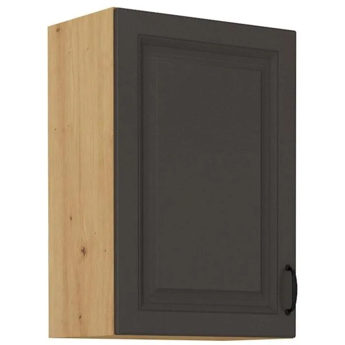 Zgornja omara PRESTIGE 50G 71V je sestavljena iz MDF plošče, debeline 16 mm, robovi so iz ABS 1 mm, ročaji pa so iz kovine v črni barvi. Korpus je narejen iz laminirane plošče, debeline 16 mm, robovi so iz melamina. Kuhinjski element je na voljo v barvi grafit / hrast in ima mehko zapiranje.