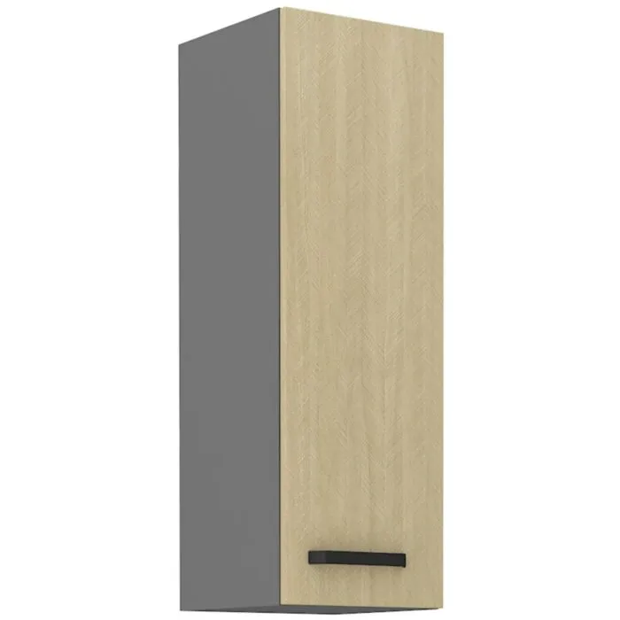 Zgornja omara RONA 30G 90V je sestavljena iz MDF plošče, debeline 16 mm, robovi so iz ABS 1 mm. Korpus je narejen iz laminirane plošče, debeline 16 mm, robovi so iz melamina. Kuhinjski element je na voljo v barvi antracit s kombinacijo hrasta in ima mehko zapiranje.