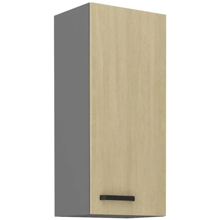 Zgornja omara RONA 40G 90V je sestavljena iz MDF plošče, debeline 16 mm, robovi so iz ABS 1 mm. Korpus je narejen iz laminirane plošče, debeline 16 mm, robovi so iz melamina. Kuhinjski element je na voljo v barvi antracit s kombinacijo hrasta in ima mehko zapiranje.