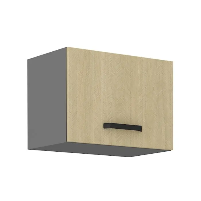 Zgornja omara RONA 50G je sestavljena iz MDF plošče, debeline 16 mm, robovi so iz ABS 1 mm. Korpus je narejen iz laminirane plošče, debeline 16 mm, robovi so iz melamina. Kuhinjski element je na voljo v barvi antracit s kombinacijo hrasta in ima mehko zapiranje.