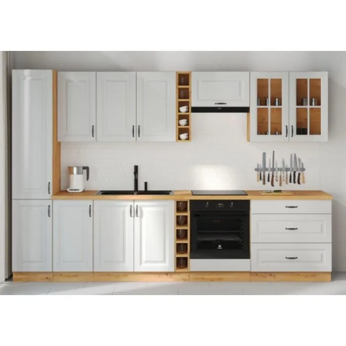 Zgornja omara STIL 40G ST ima fronto iz stekla in MDF plošče, debeline 16 mm, robovi so iz ABS 1 mm, ročaj pa je iz kovine v črni barvi. Korpus je narejen iz laminirane plošče, debeline 16 mm, robovi so iz melamina. Kuhinjski element je na voljo v barvi hrasta z belo mat barvo in ima mehko zapiranje.