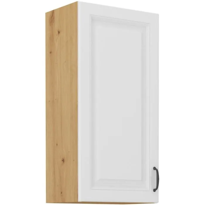 Zgornja omara STIL 45G 2 je sestavljena iz fronte iz MDF plošče, debeline 16 mm, robovi so iz ABS 1 mm, ročaj pa je iz plastike v črni barvi. Korpus je narejen iz laminirane plošče, debeline 16 mm, robovi so iz melamina. Kuhinjski element je na voljo v barvi hrasta z belo mat barvo in ima mehko zapiranje.