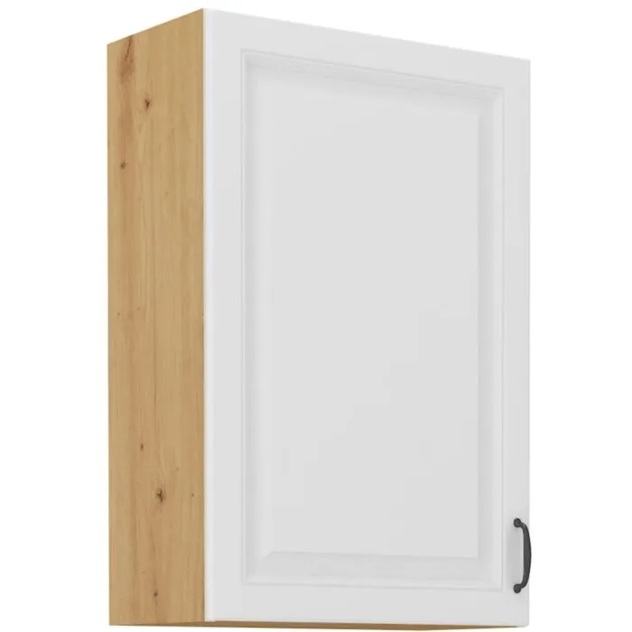 Zgornja omara STIL 60G 2 je sestavljena iz fronte iz MDF plošče, debeline 16 mm, robovi so iz ABS 1 mm, ročaj pa je iz plastike v črni barvi. Korpus je narejen iz laminirane plošče, debeline 16 mm, robovi so iz melamina. Kuhinjski element je na voljo v barvi hrasta z belo mat barvo in ima mehko zapiranje.