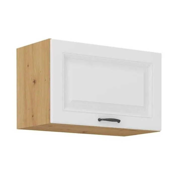 Zgornja omara STIL 60G dvižna je sestavljena iz fronte iz MDF plošče, debeline 16 mm, robovi so iz ABS 1 mm, ročaj pa je iz kovine v črni barvi. Korpus je narejen iz laminirane plošče, debeline 16 mm, robovi so iz melamina. Kuhinjski element je na voljo v barvi hrasta z belo mat barvo in ima mehko zapiranje.
