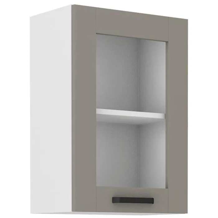 Zgornja omara TAJA 40G ST 71V je sestavljena iz MDF plošče, debeline 16 mm, robovi so iz ABS 1 mm, ročaji pa so iz kovine v črni barvi. Korpus je narejen iz laminirane plošče, debeline 16 mm, robovi so iz melamina. Kuhinjski element je na voljo v barvi bela/taupe in ima mehko zapiranje.