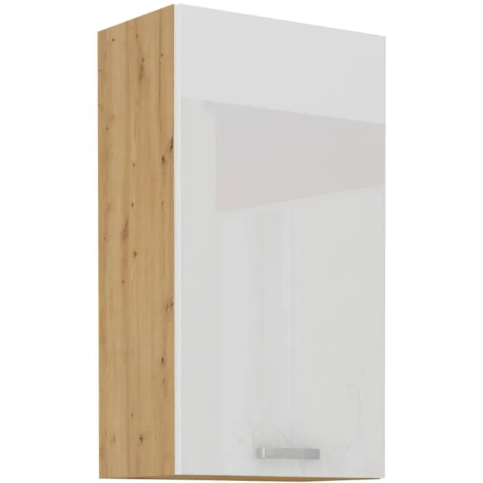 Zgornja omara TISA 45G 90V fronta je izdelana iz laminirane plošče, debeline 16 mm, robovi so iz ABS 1 mm. Ročaj je iz kovine v sivi barvi. Korpus je narejen iz laminirane plošče, debeline 16 mm, robovi so iz melamina. Kuhinjski element je na voljo v treh barvah visokega sijaja. V komentarju dopišete, katero barvno kombinacijo želite. Kuhinjski elementi imajo sistem mehkega zapiranja.