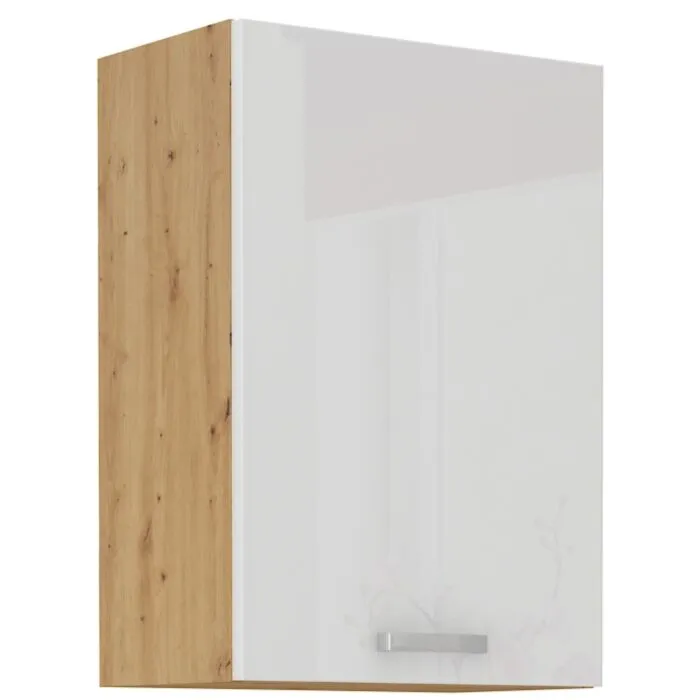 Zgornja omara TISA 50G 2 fronta je izdelana iz laminirane plošče, debeline 16 mm, robovi so iz ABS 1 mm. Ročaj je iz kovine v sivi barvi. Korpus je narejen iz laminirane plošče, debeline 16 mm, robovi so iz melamina. Kuhinjski element je na voljo v treh barvah visokega sijaja. V komentarju dopišete, katero barvno kombinacijo želite. Kuhinjski elementi imajo sistem mehkega zapiranja.