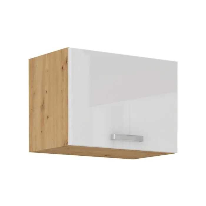 Zgornja omara TISA 50G dvižna, fronta je izdelana iz laminirane plošče, debeline 16 mm, robovi so iz ABS 1 mm. Ročaj je iz kovine v sivi barvi. Korpus je narejen iz laminirane plošče, debeline 16 mm, robovi so iz melamina. Kuhinjski element je na voljo v treh barvah visokega sijaja. V komentarju dopišete, katero barvno kombinacijo želite. Kuhinjski elementi imajo sistem mehkega zapiranja.